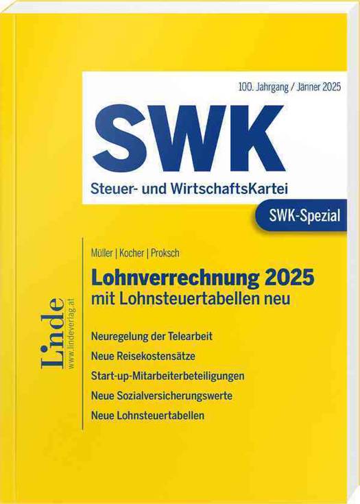 Von der Neuregelung der Telearbeit bis zur Förderung von Start-up-Mitarbeiterbeteiligungen: Das "SWK-Spezial Lohnverrechnung 2025" berücksichtigt die Rechtslage auf dem Gebiet der Lohnverrechnung mit Stand 1.1.2025 und stellt diese - praxisbezogen gegliedert - anhand zahlreicher Übersichten und Beispiele sowie hilfreicher Lohnverrechnungstabellen dar.