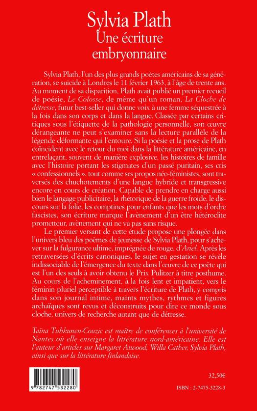 Le premier versant de cette étude propose une plongée dans l'univers bleu des poèmes de jeunesse de Sylvia Plath, l'un des plus grands poètes américain des années 60, pour s'achever sur la fulgurance ultime, imprégnée de rouge, d'Ariel. Le sujet en gestation se révèle indissociable de l'émergence du texte dans l'œuvre de ce poète qui est l'un des seuls à avoir obtenu le Prix Pulitzer à titre posthume. Maints mythes, rythmes et figures archaïques sont revues et déconstruits pour dire ce monde sous cloche, univers de recherche autant que de détresse.