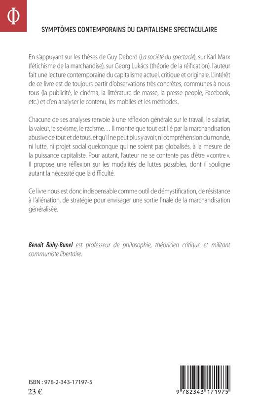 En s'appuyant sur les thèses de Debord, Marx et Lukacs, l'auteur fait une lecture contemporaine du capitalisme actuel. Ce livre part d'observations sur la publicité, le cinéma, la littérature de masse ou les réseaux sociaux, etc.. Chaque analyse renvoie à une réflexion sur le travail, le salariat ou la valeur. Tout est lié par la marchandisation abusive de tout et de tous. Il ne peut plus y avoir ni compréhension du monde, ni lutte, ni projet social qui ne soient globalisés, à la mesure de la puissance capitaliste. L'auteur propose une réflexion sur les luttes possibles. Ce livre nous est indispensable contre la mystification, l'aliénation et la marchandisation généralisée.