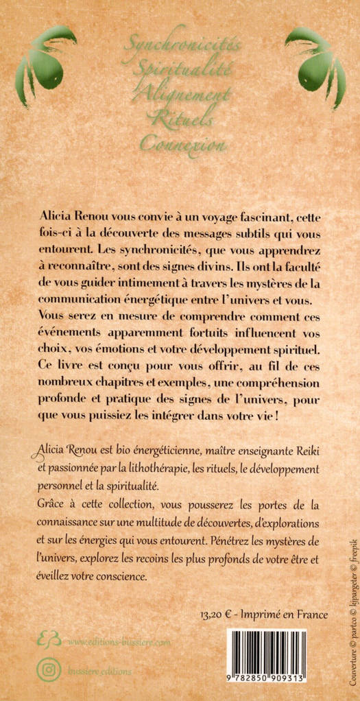 Ce nouvel ouvrage d'Alicia Renou vous convie à un voyage fascinant, à la découverte des messages subtils qui vous entourent. Les synchronicités, que vous apprendrez à reconnaître, sont ces coïncidences parfaites et ces signes divins. Ils ont la faculté de vous guider intimement à travers les mystères de la communication énergétique entre vous et l'univers. Vous deviendrez en mesure de comprendre comment ces événements apparemment fortuits influencent vos choix, vos émotions et votre développement spirituel. Ce livre est conçu pour vous offrir, au fil de ces nombreux chapitres, une compréhension profonde et pratique des signes de l'univers, vous permettant ainsi de les reconnaître, de les interpréter, de les décoder et de les intégrer dans votre vie.