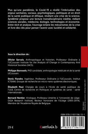 Plus qu'une pandémie, le Covid-19 a révélé l'imbrication des enjeux sanitaires, sociaux, psychologiques, politiques et en droit de la santé publique et éthique, révélant une crise de la science. Syndémie propose une lecture transdisciplinaire inédite, mêlant sciences sociales, médecine, biologie, technologies et économie.Entre récit et analyse, l'ouvrage éclaire les mécanismes de la crise et livre des clés pour penser l'avenir avec lucidité et solidarité.Sous la direction de :Olivier Servais, Anthropologue et historien, Professeur Ordinaire à l'UCLouvain Institute for the Analysis of Change in Contemporary And Historical Societies (IACS).Philippe Bonneels, PhD candidate, anthropologie médicale et de la santéUCLouvain.Denis Flandre, Ingénieur, Professeur Ordinaire à l'UCLouvain, Institut ICTEAM, Groupe de recherche en micro-nano-systèmes électroniques.Élisabeth Paul, Chargée de cours à l'Ecole de santé publique de l'ULB, Centre de recherche en Politiques et systèmes de santé - santé internationale.Bernard Rentier, Virologue, Professeur émérite à l'Université de Liège;GIGA Research Institute, Recteur honoraire de l'ULiège (2005-2014),Membre de l'Académie Royale de Belgique.