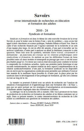 Ce numéro met au jour les différentes formes de liens possibles entre syndicalisme et formation. Après une première partie historique, et une seconde institutionnelle, ce volume traite de la formation syndicale ou des dispositifs mis en uvre par les organisations syndicales pour permettre aux militants d'exercer leur mandat de la meilleure façon possible, et d'autre part de la place prise par les syndicats dans le développement d'une politique de formation.