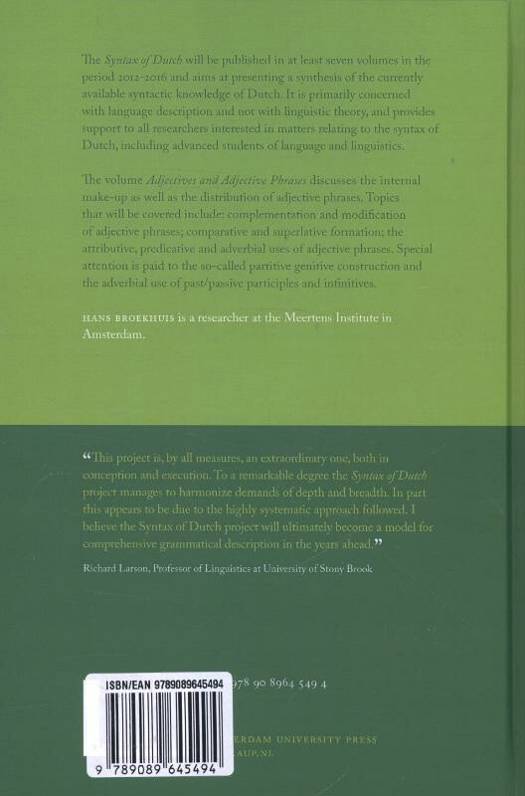 14% discount on a subscription to the complete series, please contact us via orders@aup.nl. The Syntax of Dutch will be published in at least seven volumes in the period 2012-2016 and aims at presenting a synthesis of the currently available syntactic knowledge of Dutch. It is primarily concerned with language description and not with linguistic theory, and provides support to all researchers interested in matters relating to the syntax of Dutch, including advanced students of language and linguistics.