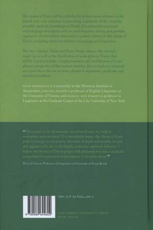 The Syntax of Dutch will be published in at least seven volumes in the period 2012-2016 and aims at presenting a synthesis of the currently available syntactic knowledge of Dutch. It is primarily concerned with language description and not with linguistic theory, and provides support to all researchers interested in matters relating to the syntax of Dutch, including advanced students of language and linguistics.