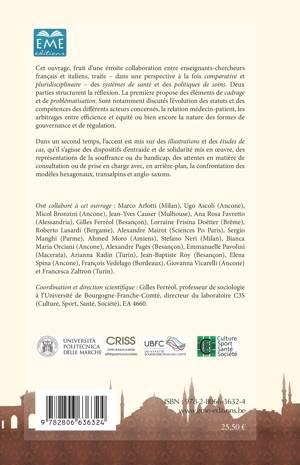 Cet ouvrage, fruit d'une étroite collaboration entre enseignants-chercheurs français et italiens, traite - dans une perspective à la fois comparative et pluridisciplinaire - des systèmes de santé et des politiques de soins. Deux parties structurent la réflexion. La première propose des éléments de cadrage et de problématisation. Sont notamment discutés l'évolution des statuts et des compétences des différents acteurs concernés, la relation médecin-patient, les arbitrages entre efficience et équité ou bien encore la nature des formes de gouvernance et de régulation.