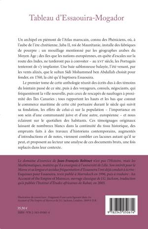 Ce premier tome réunit des écrits de témoins du lointain passé de cet archipel en piémont de l'Atlas marocain, que le sultan Sidi Mohammed ben Abdallah choisit pour fonder, en 1760, la cité qu'il baptisera Essaouira. Voyageurs, consuls, négociants, rescapés de naufrages : tous rapportent les hauts et les bas que connut le commerce maritime de cette cité portuaire durant le siècle qui suivit sa fondation, ses effets sur la population, et nous éclairent sur le quotidien des habitants.