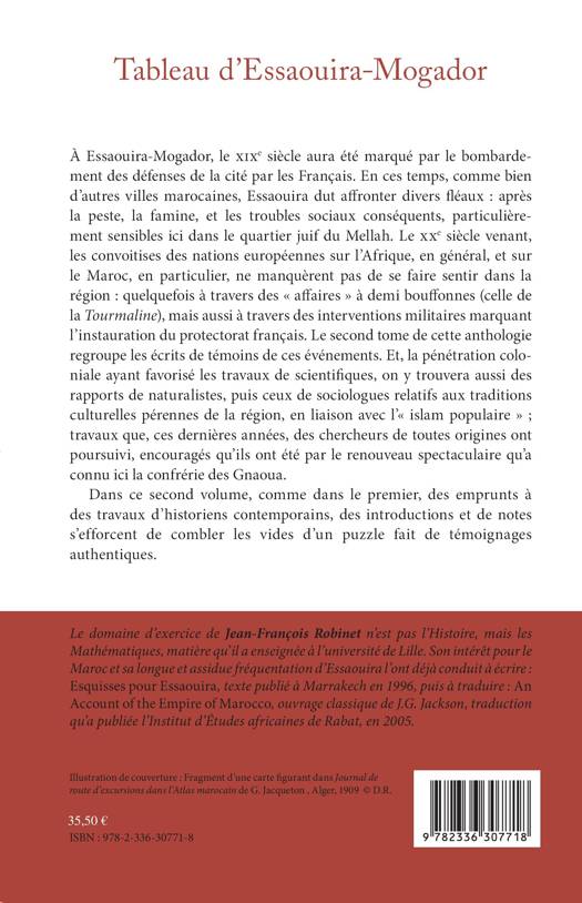 A Essaouira-Mogador, le XIXe siècle aura été marqué par le bombardement des défenses de la cité par les Français et divers fléaux tels que la peste, la famine et les troubles sociaux conséquents. Le XXe siècle venant, les convoitises des nations européennes sur l'Afrique, en particulier sur le Maroc, se firent ressentir à travers des "affaires" semi bouffonnes et des interventions militaires marquant l'instauration du protectorat français. Ce second tome regroupe les écrits de témoins de ces événements.