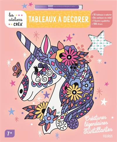 10 tableaux à colorier et à détacher, avec des contours en relief pour un résultat sans bavure, 1 feutre à paillettes violet et 100 strass de deux formes et couleurs différentes.