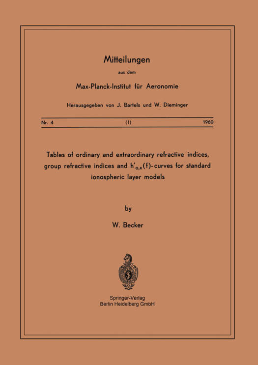 The N(h)-Working Party, a Group in Commission III of URS! (URS! Information Bulletin No. 112, p. 12) suggested these calculations of ordinary and extraordinary refractive indices n, vertical group refractive indices c/U, and virtual o, x o, x 1 heights h (f), for an Epstein, cosine and parabolic layer model. c ist the free 0 X 1 space velocity of light . U and U denote vertical ordinary and extraordinary 0 X group velocities. The data are intended to facilitate real height (h) computations from 1 1 observed, h (f)-traces. Especially the h (f)-data are intended also to allow o, x o, x for tests of existing reduction methods. For ionization minimum investigations an additional set of tables is presented. These tables represent the virtual paths 1 6 h (f) of sounding pulses which penetrate an ionospheric layer of parabolic o, x 1 shape; they can be used together with the abovementioned standard h (f)-curves o, x 1 to give ordinary and extraordinary h (f)-traces for any combination of a lower O, X parabolic layer and an upper Epstein, cosine or parabolic electron density distribution. Ordinary group refractive index tables have already been published by D. H. SHINN [ 1] 1 and by Vv. BECKER [ 2] - Their value s of cp, the angle of inclination of the earth s magnetic field, are slightly different from those used here. These tables may be used 1 as additional sets for interpolation purposes. D. H.