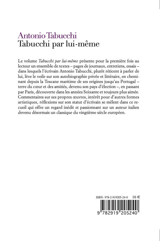 Le volume Tabucchi par lui-même présente pour la première fois au lecteur un ensemble de textes - pages de journaux, entretiens, essais - dans lesquels l'écrivain Antonio Tabucchi, plutôt réticent à parler de lui, lève le voile sur son autobiographie privée et littéraire, en chemi-nant depuis la Toscane maritime de ses origines jusqu'au Portugal - terre du coeur et des amitiés, devenu son pays d'élection -, en passant par Paris, découverte dans les années Soixante et toujours plus aimée. Commentaires sur ses propres oeuvres, intérêt pour d'autres formes artistiques, réflexions sur son statut d'écrivain se mêlent dans ce re-cueil qui offre un regard inédit et passionnant sur un auteur italien devenu désormais un classique du vingtième siècle européen.