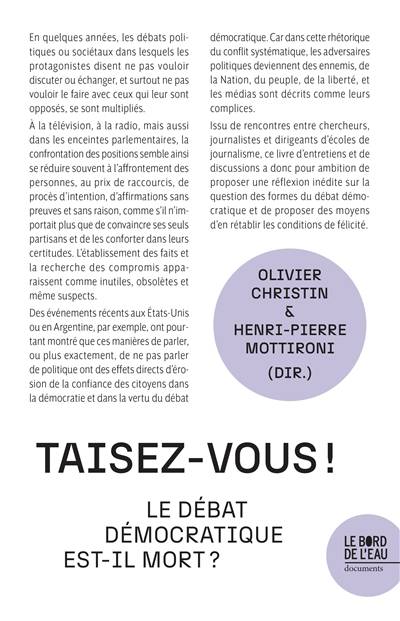 Issu de rencontres entre chercheurs, journalistes et dirigeants d'écoles de journalisme, ce livre d'entretiens et de discussions, a donc pour ambition de proposer une réflexion inédite sur la question des formes du débat démocratique et de proposer des moyens d'en rétablir les conditions de félicité.