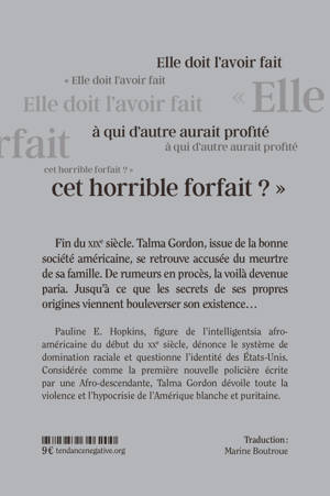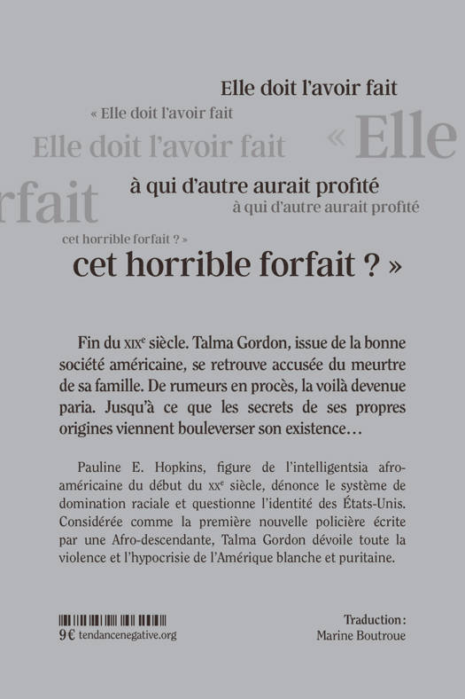 Lors d'une soirée mondaine, un éminent docteur raconte l'étrange histoire de Talma Gordon. Une nuit d'orage, le capitaine Gordon, sa nouvelle épouse et leur fils sont assassinés. Sur les lieux du drame, Talma, fille déshéritée d'un premier mariage "honteux", devient la principale suspecte. Ce qu'elle ignore encore, c'est que pour son père elle était déjà coupable, coupable d'être afro-descendante. Inédite en français, Talma Gordon est la première nouvelle policière écrite par une femme afro-descendante, Pauline E. Hopkins, qui déconstruit le mythe de l'identité américaine "pure" et vient déranger des idéologies encore malheureusement présentes dans nos sociétés occidentales.
