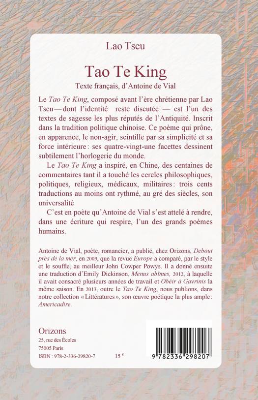 Le Tao Te King, composé avant l'ère chrétienne par Lao Tseu est l'un des textes de sagesse les plus réputés de l'Antiquité. Ce poème scintille par sa simplicité et sa force intérieure : ses quatre-vingt-une facettes dessinent subtilement l'horlogerie du monde. C'est en poète qu'Antoine de Vial s'est attelé à rendre, dans une écriture qui respire, l'un des grands poèmes humains.