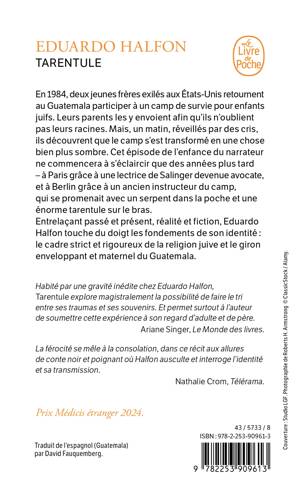 Habité par une gravité inédite chez Eduardo Halfon, Tarentule explore magistralement la possibilité de faire le tri entre ses traumas et ses souvenirs. Et permet surtout à l’auteur de soumettre cette expérience à son regard d'adulte et de père. Ariane Singer, Le Monde des livres.
