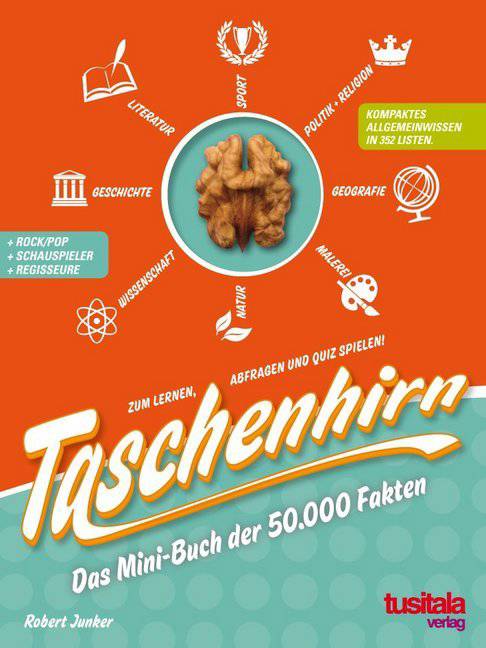 Dieses Listen-Buch ist vollgepackt mit wichtigem Allgemeinwissen aus Geschichte, Geografie, Politik, Wissenschaft, Kunst & Literatur, Klassik, Rock & Pop, Filme & Schauspieler, Sport und vieles mehr. Insgesamt werden über 50.000 Daten und Fakten übersichtlich in 352 Listen & Tabellen aufgegliedert.Zusammenhänge lassen sich so auf den ersten Blick erkennen und Gegensätzliches sofort miteinander vergleichen. Das nervige Lesen von viel zu langen Texten entfällt. Fakten werden kurz und knackig präsentiert, wodurch das Gelernte länger im Gedächtnis haften bleibt. Das Taschenhirn eignet sich wunderbar für Kinder (ab 12 Jahren), Schüler, Studenten und Erwachsene. Zum Lernen, Abfragen und Quiz spielen. Zuhause, in Schule, Studium und Beruf oder auf Reisen.