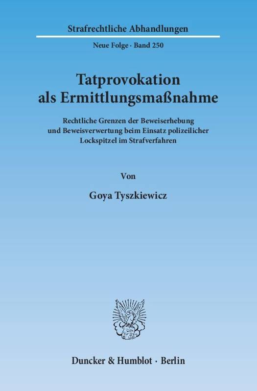 Tatprovokationen sind unter Zustimmung der Rechtsprechung des BGH fester Bestandteil der deutschen Strafverfolgung. Die Arbeit verfolgt das Ziel, einen Beitrag zur Reduzierung des bestehenden Spannungsfeldes zwischen Belangen der Strafverfolgung und verfassungs- sowie menschenrechtlichen Positionen zu leisten. Einleitend wird der Begriff der Tatprovokation definiert. Es wird dargelegt, warum die StPO keine hinreichende Ermächtigungsgrundlage für derartige Einsätze vorsieht. Die aktuelle Rechtslage wird unter Einbeziehung der Rechtsprechung des BGH und EGMR aufgearbeitet, um die Maßstäbe für eine Legitimierung von Tatprovokationen herauszustellen. Sie bilden die Basis für den Kern der Arbeit. Er besteht in dem Vorschlag, Tatprovokationen nicht zur Verfolgung der provozierten, sondern bereits begangener Taten zu legitimieren. Die praktische Umsetzung dieses Ansatzes wird dabei unter besonderer Berücksichtigung der "Bekämpfung" der Betäubungsmittelkriminalität stets im Blick behalten.