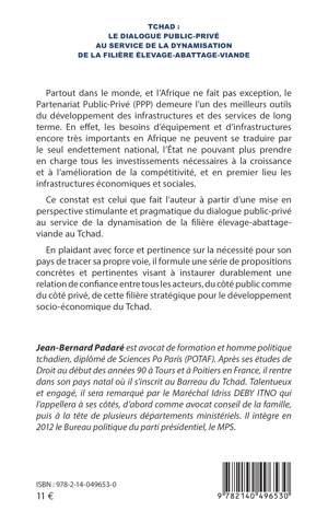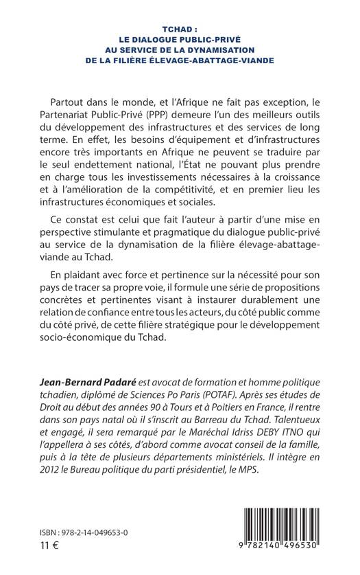 Partout dans le monde, et l'Afrique ne fait pas exception, le Partenariat Public-Privé (PPP) demeure l'un des meilleurs outils du développement des infrastructures et des services de long terme. En effet, les besoins d'équipement et d'infrastructures encore très importants en Afrique ne peuvent se traduire par le seul endettement national, l'État ne pouvant plus prendre en charge tous les investissements nécessaires à la croissance et à l'amélioration de la compétitivité, et en premier lieu les infrastructures économiques et sociales. Ce constat est celui que fait l'auteur à partir d'une mise en perspective stimulante et pragmatique du dialogue public-privé au service de la dynamisation de la filière élevage-abattage-viande au Tchad. En plaidant avec force et pertinence sur la nécessité pour son pays de tracer sa propre voie, il formule une série de propositions concrètes et pertinentes visant à instaurer durablement une relation de confiance entre tous les acteurs, du côté public comme du côté privé, de cette filière stratégique pour le développement socio-économique du Tchad.