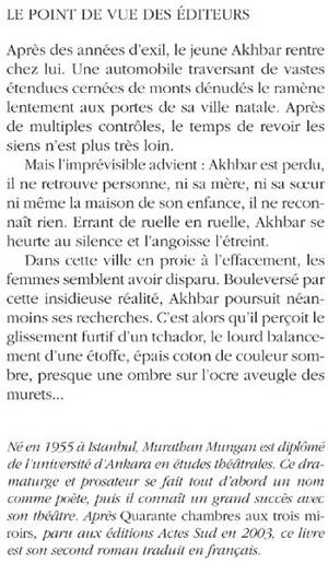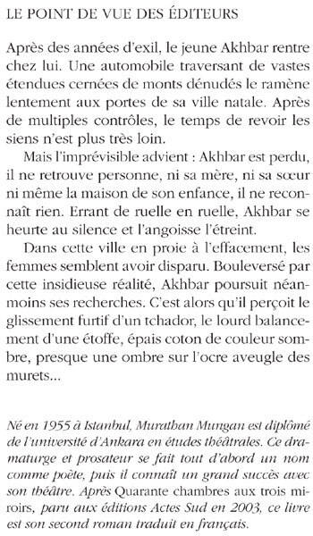 Après des années d'exil, le jeune Akhbar rentre chez lui. Une automobile traversant de vastes étendues cernées de monts dénudés le ramène lentement aux portes de sa ville natale. Après de multiples contrôles, le temps de revoir les siens n'est plus très loin. Mais l'imprévisible advient : Akhbar est perdu, il ne retrouve personne, ni sa mère, ni sa soeur ni même la maison de son enfance, il ne reconnaît rien. Errant de ruelle en ruelle, Akhbar se heurte au silence et l'angoisse l'étreint. Dans cette ville en proie à l'effacement, les femmes semblent avoir disparu. Bouleversé par cette insidieuse réalité, Akhbar poursuit néanmoins ses recherches. C'est alors qu'il perçoit le glissement furtif d'un tchador, le lourd balancement d'une étoffe, épais coton de couleur sombre, presque une ombre sur l'ocre aveugle des murets... Né en 1955 à Istanbul, Murathan Mungan est diplômé de l'université d'Ankara en études théâtrales. Ce dramaturge et prosateur se fait tout d'abord un nom comme poète, puis il connaît un grand succès avec son théâtre. Après Quarante chambres aux trois miroirs, paru aux éditions Actes Sud en 2003, ce livre est son second roman traduit en français.