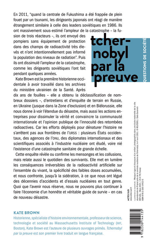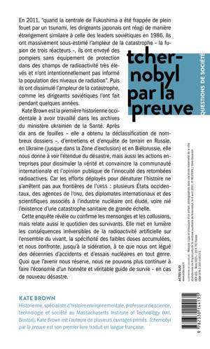 Kate Brown est la première historienne occidentale à avoir travaillé dans les archives du ministère soviétique de la Santé. Après dix ans de fouilles - elle a obtenu la déclassification de nombreux dossiers -, d'entretiens et d'enquête de terrain en Russie, en Ukraine et en Biélorussie (jusque dans la Zone d'exclusion), elle nous donne à voir l'étendue du désastre, mais aussi les actions entreprises pour dissimuler la vérité et convaincre la communauté internationale et l'opinion publique de l'innocuité des retombées radioactives. Car les efforts déployés pour dénaturer l'histoire ne s'arrêtent pas aux frontières de l'URSS : plusieurs États occidentaux, des agences de l'ONU, des diplomates internationaux et des scientifiques associés à l'industrie nucléaire ont éludé, voire nié l'existence d'une catastrophe sanitaire de grande échelle.