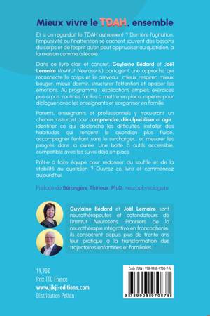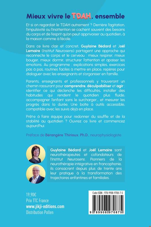 Mieux vivre le TDAH, ensembleEt si on regardait le TDAH autrement ? Derrière l’agitation, l’impulsivité ou l’inattention se cachent souvent des besoins du corps et de l’esprit qu’on peut apprivoiser au quotidien, à la maison comme à l’école.Dans ce livre clair et concret, Guylaine Bédard et Joël Lemaire (Institut Neurosens) partagent une approche qui reconnecte le corps et le cerveau : mieux respirer, mieux bouger, mieux dormir, structurer l’attention et apaiser les émotions. Au programme : explications simples, exercices pas à pas, routines faciles à mettre en place, repères pour dialoguer avec les enseignants et s’organiser en famille.Parents, enseignants et professionnels y trouveront un chemin rassurant pour comprendre, déculpabiliser et agir : identifier ce qui déclenche les difficultés, installer des habitudes qui rendent le quotidien plus fluide, accompagner l’enfant sans le surcharger… et mesurer les progrès dans la durée. Une boîte à outils accessible, compatible avec les suivis déjà en place.Prêt·e à faire équipe pour redonner du souffle et de la stabilité au quotidien ? Ouvrez ce livre et commencez aujourd’hui.Préface de Bérangère Thirioux, Ph.D., neurophysiologiste.
