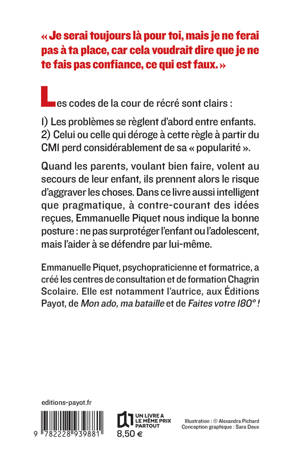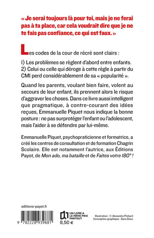 Quand les parents, voulant bien faire, volent au secours de leur enfant, ils prennent le risque d'aggraver les choses. Dans ce livre aussi intelligent que pragmatique, à contre- courant des idées reçues, Emmanuelle Piquet nous indique la bonne posture: ne pas surprotéger l'enfant ou l'adolescent, mais l'aider à se défendre lui-même.