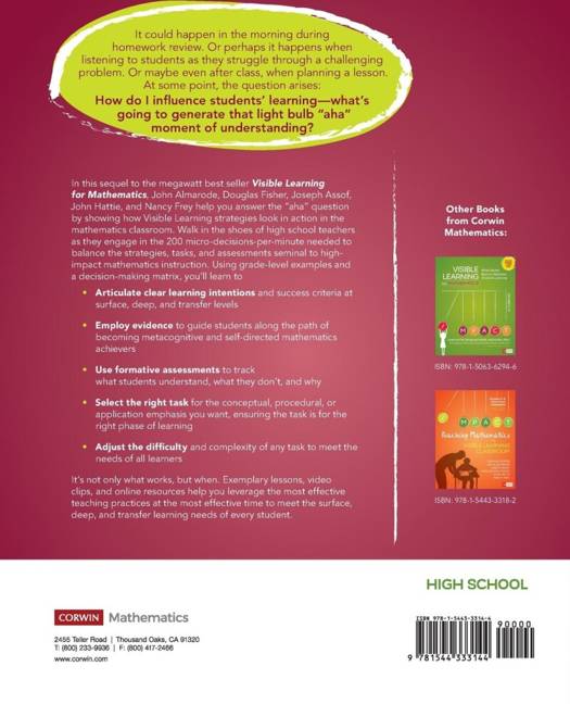 How do you generate that lightbulb "aha" moment of understanding for your students? This book helps to answer that question by showing Visible Learning strategies in action in high-impact mathematics classrooms. Walk in the shoes of teachers as they engage in the countless micro-decisions required to balance strategies, tasks, and assessments, demonstrating that it's not only what works, but when. A decision-making matrix and grade-leveled examples help you leverage the most effective teaching practices at the most effective time to meet the surface, deep, and transfer learning needs of every student.