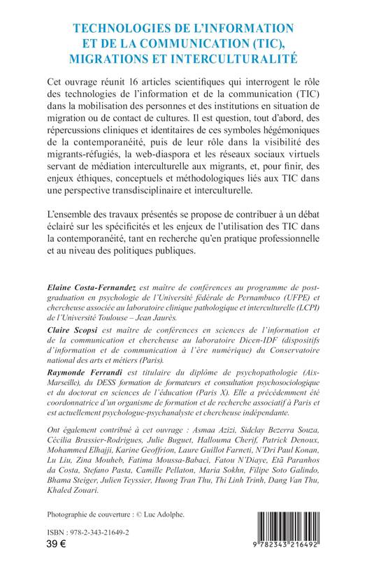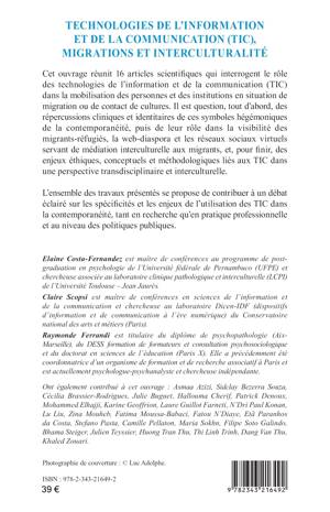 Cet ouvrage réunit 16 articles scientifiques qui interrogent le rôle des technologies de l'information et de la communication (TIC) dans la mobilisation des personnes et des institutions en situation de migration ou de contact de cultures. Il est question, tout d'abord, des répercussions cliniques et identitaires de ces symboles hégémoniques de la contemporanéité, puis de leur rôle dans la visibilité des migrants-réfugiés, la web-diaspora et les réseaux sociaux virtuels servant de médiation interculturelle aux migrants, et, pour finir, des enjeux éthiques, conceptuels et méthodologiques liés aux TIC dans une perspective transdisciplinaire et interculturelle.