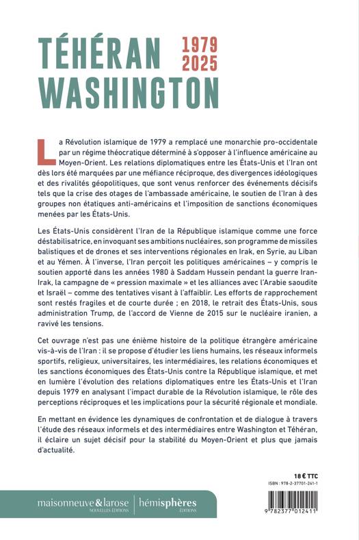 La Révolution islamique de 1979 a remplacé une monarchie pro-occidentale par un régime théocratique déterminé à s’opposer l’influence américaine au Moyen-Orient. Les relations diplomatiques entre les États-Unis et l’Iran ont dès lors été marquées par une méfiance réciproque, des divergences idéologiques et des rivalités géopolitiques. Cet ouvrage n’est pas une énième histoire de la politique étrangère américaine vis-à-vis de l’Iran : il se propose d’étudier les liens humains, les réseaux informels sportifs, religieux, universitaires, les intermédiaires, les relations économiques et les sanctions économiques des États-Unis contre la République islamique, et met en lumière l’évolution des relations diplomatiques entre les États-Unis et l’Iran depuis 1979 en analysant l’impact durable de la Révolution islamique, le rôle des perceptions réciproques et les implications pour la sécurité régionale et mondiale. En mettant en évidence les dynamiques de confrontation et de dialogue à travers l’étude des réseaux informels et des intermédiaires entre Washington et Téhéran, il éclaire un sujet décisif pour la stabilité du Moyen-Orient et plus que jamais d’actualité.