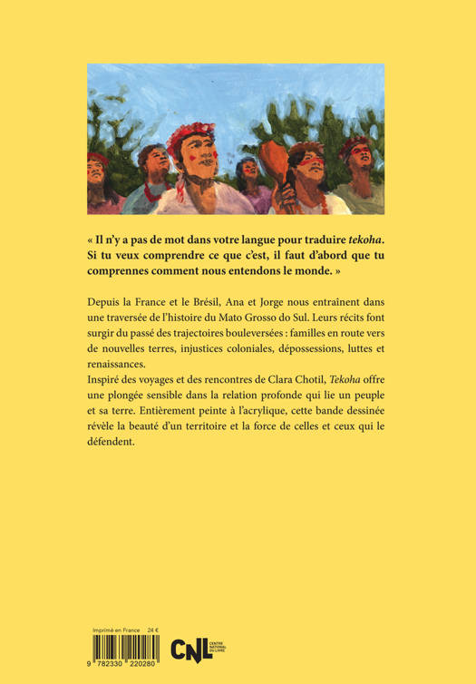 « Il n'y a pas de mot dans votre langue pour traduire tekoha. Si tu veux comprendre ce que c'est, il faut d'abord que tu comprennes comment nous entendons le monde. » Depuis la France et le Brésil, Ana et Jorge nous entraînent dans une traversée de l'histoire du Mato Grosso do Sul. Leurs récits font surgir du passé des trajectoires bouleversées : familles en route vers de nouvelles terres, injustices coloniales, dépossessions, luttes et renaissances. Inspiré des voyages et des rencontres de Clara Chotil, Tekoha offre une plongée sensible dans la relation profonde qui lie un peuple et sa terre. Entièrement peinte à l'acrylique, cette bande dessinée révèle la beauté d'un territoire et la force de celles et ceux qui le défendent.