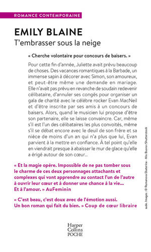 Pour cette fin d’année, Juliette avait prévu beaucoup de choses. Des vacances romantiques à la Barbade, un immense sapin à décorer avec Simon, son amoureux, et peut-être même une demande en mariage. Elle n’avait pas prévu en revanche de soudain redevenir célibataire, d’annuler ses congés pour organiser un gala de charité avec le célèbre rocker Evan MacNeil et d’être inscrite par ses amis à un concours de baisers. Alors, quand le musicien lui propose d’être son partenaire, elle se laisse convaincre. Car, même s’il est l’un des célibataires les plus convoités, même s’il se débat encore avec le deuil de son frère et sa nièce de moins d’un an qui n’a plus que lui, Evan parvient à la mettre en confiance. À tel point qu’elle en viendrait presque à abaisser le mur de glace qu’elle a érigé autour de son cœur…