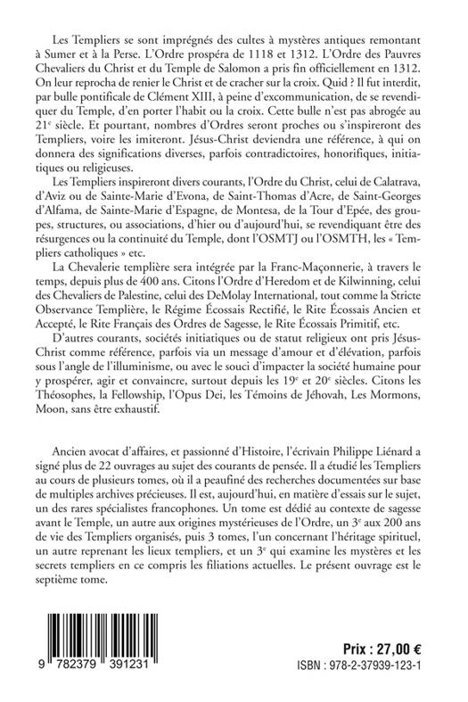 Ils auraient renié le Christ et craché sur des croix! Pour la première fois, un ouvrage examine les courants de pensées centrés autour de la notion de Jésus-Christ. Spécialiste de premier plan de la question, l’auteur rappelle d’abord d’où viennent et qui furent les Templiers. Il se penche ensuite sur les Ordres proches et prolonge par les suites à travers les multiples structures qui s’en inspirent ou s’en sont imprégnées: Ordres chevaleresques, honorifique, religieux ou initiatiques, jusqu’à nos jours. Il évoque la franc-maçonnerie templière, et nombre de sociétés discrètes où Jésus se trouve être la référence, à des fins diverses. Les Templiers inspireront divers courants, l’Ordre du Christ, celui de Calatrava, d’Aviz ou de Sainte-Marie d’Evona, de Saint-Thomas d’Acre, de Saint-Georges d’Alfama, de Sainte-Marie d’Espagne, de Montesa, de la Tour d’Epée, des groupes, structures, ou associations, d’hier ou d’aujourd’hui, se revendiquant être des résurgences ou la continuité du Temple, dont l’OSMTJ ou l’OSMTH, les «Templiers catholiques» etc. La Chevalerie templière sera intégrée par la Franc-Maçonnerie, à travers le temps, depuis plus de 400 ans. Citons l’Ordre d’Heredom et de Kilwinning, celui des Chevaliers de Palestine, celui des DeMolay International, tout comme la Stricte Observance Templière, le Régime Écossais Rectifié, le Rite Écossais Ancien et Accepté, le Rite Français des Ordres de Sagesse, le Rite Écossais Primitif, etc. D’autres courants, sociétés initiatiques ou de statut religieux ont pris Jésus-Christ comme référence, parfois via un message d’amour et d’élévation, parfois sous l’angle de l’illuminisme, ou avec le souci d’impacter la société humaine pour y prospérer, agir et convaincre, surtout depuis les 19e et 20e siècles. Citons les Théosophes, la Fellowship, l’Opus Dei, les Témoins de Jéhovah, Les Mormons, Moon, sans être exhaustif.