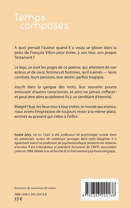 À quoi pensait l’auteur quand il a voulu se glisser dans la peau de François Villon pour écrire, à son tour, son propre Testament ? Le legs, ce sont les pages de ce poème, qui attestent de son auteur, et de ceux, femmes et hommes, qu’il a aimés — leurs combats, leurs passions, leur destin, parfois tragique. Inscrit dans la gangue des mots, leur souvenir pourra émouvoir d’autres consciences, et ainsi ne jamais s’effacer; et peut-être alors accèderont-ils à un semblant d’éternité. Malgré l’âge, les lieux tour à tour visités, le monde qui avance, nous avons l’impression de toujours rester à la même place, arrimés au présent qui s’étire à l’infini.