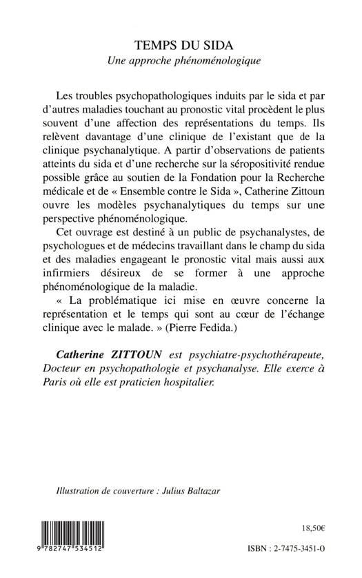 Les troubles psychopathologiques induits par le sida et par d'autres maladies touchant au pronostic vital procèdent le plus souvent d'une affection des représentations du temps. Ils relèvent davantage d'une clinique de l'existant que de la clinique psychanalytique. A partir d'observations de patients atteints du sida et d'une recherche sur la séropositivité, l'auteur ouvre les modèles psychanalytiques du temps sur une perspective phénoménologique.