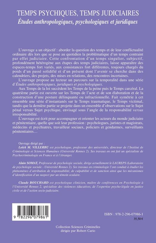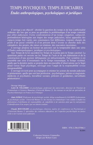 Cet ouvrage propose un parcours sur la temporalité : aux Temps de la loi succèdent les Temps de la peine puis le Temps carcéral. Une partie est consacrée aux Temps de l'acte et de son élaboration et de la construction d'une posture délinquante ou infractionnelle. S'y ajoute une série d'instantanés sur le Temps traumatique, le Temps victimal, et des observations sur le Sujet pénal versus Sujet psychique, envisagé sous l'angle de la responsabilité versus l'irresponsabilité.