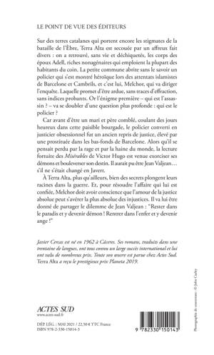 Sur des terres catalanes qui portent encore les stigmates de la bataille de l'Èbre, Terra Alta est secouée par un affreux fait divers : on a retrouvé, sans vie et déchiquetés, les corps des époux Adell, riches nonagénaires qui emploient la plupart des habitants du coin. La petite commune abrite sans le savoir un policier qui s'est montré héroïque lors des attentats islamistes de Barcelone et Cambrils, et c'est lui, Melchor, qui va diriger l'enquête. Laquelle promet d'être ardue, sans traces d'effraction, sans indices probants. Or l'énigme première - qui est l'assassin ? - va se doubler d'une question plus profonde : qui est le policier ? Car avant d'être un mari et père comblé, coulant des jours heureux dans cette paisible bourgade, le policier converti en justicier obsessionnel fut un ancien repris de justice, élevé par une prostituée dans les bas-fonds de Barcelone. Alors qu'il se pensait perdu par la rage et par la haine du monde, la lecture fortuite des Misérables de Victor Hugo est venue exorciser ses démons et bouleverser son destin. Il aurait pu être Jean Valjean... s'il ne s'était changé en Javert. À Terra Alta, plus qu'ailleurs, bien des secrets plongent leurs racines dans la guerre. Et, pour résoudre l'affaire qui lui est confiée, Melchor doit avoir conscience que l'amour de la justice absolue peut s'avérer la plus absolue des injustices. Il va lui être donné de partager le dilemme de Jean Valjean : "Rester dans le paradis et y devenir démon ! Rentrer dans l'enfer et y devenir ange !"