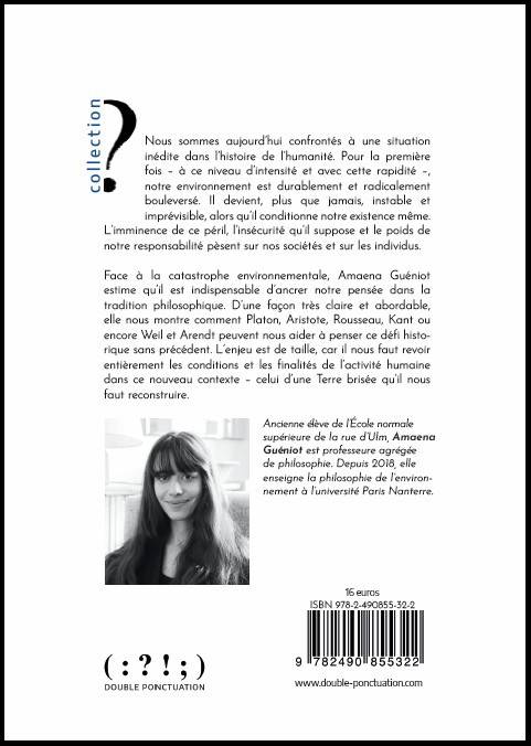 Nous sommes aujourd’hui confrontés à une situation inédite dans l’histoire de l’humanité. Pour la première fois – à ce niveau d’intensité et avec cette rapidité –, nos conditions environnementales sont durablement et radicalement bouleversées. Elles deviennent instables et imprévisibles, alors qu’elles conditionnent notre existence même. L’imminence de ce péril, l’insécurité qu’il suppose et le poids de notre responsabilité pèsent sur nos sociétés et sur les individus. Face à ce défi historique sans précédent, Amaena Guéniot estime qu’il est non seulement possible, mais même indispensable d’ancrer notre pensée dans la tradition philosophique. D’une façon très claire et abordable, elle nous montre comment Platon, Aristote, Rousseau, Kant ou encore Weil et Arendt peuvent nous aider à penser ce défi. L’enjeu est de taille, car il nous faut revoir entièrement les conditions et les finalités de l’activité humaine dans ce nouveau contexte – celui d’une Terre brisée qu’il nous faut reconstruire.