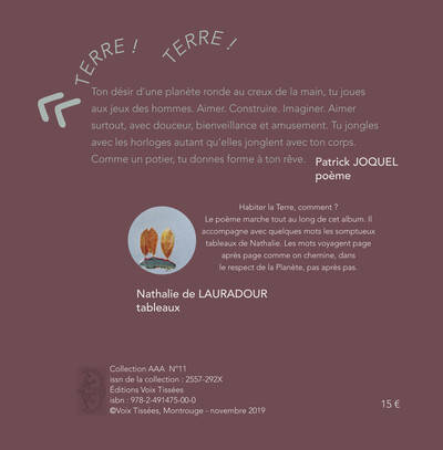 Habiter la Terre, comment ? Le poème marche tout le long de cet album. Il accompagne avec quelques mots les tableaux de l'illustratrice. Les mots voyagent page après page, comme on chemine, dans le respect de la planète, pas après pas.Patrick Joquel marche avec l'enfant "qui s'étonne" et "donne forme à son rêve" petit à petit.