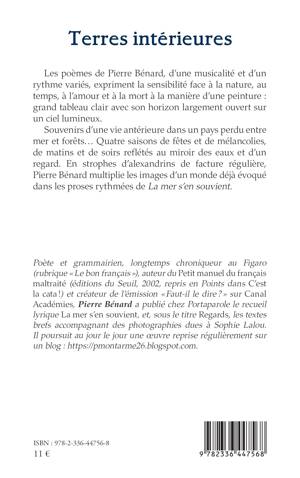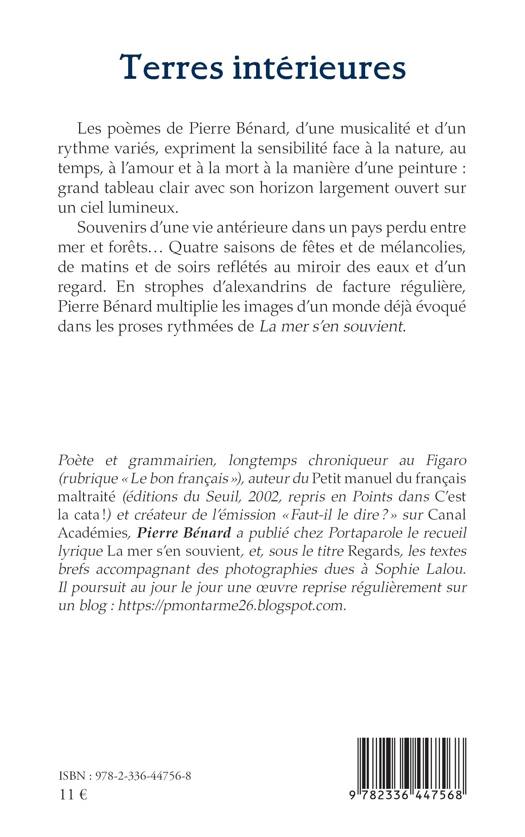 Souvenirs d’une vie antérieure dans un pays perdu entre mer et forêts… Quatre saisons de fêtes et de mélancolies, de matins et de soirs reflétés au miroir des eaux et d’un regard. En strophes d’alexandrins de facture régulière, Pierre Bénard multiplie les images brèves d’un monde déjà évoqué dans les proses rythmées de La mer s’en souvient.
