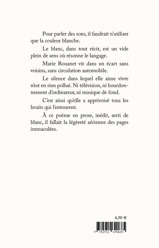 Pour parler des sons, il faudrait n’utiliser que la couleur blanche. Le blanc, dans tout récit, est un vide plein de sens où résonne le langage. Marie Rouanet vit dans un écart sans voisins, sans circulation automobile. Le silence dans lequel elle aime vivre n’est en rien pollué. Ni télévision, ni bourdonnement d’ordinateur, ni musique de fond. C’est ainsi qu’elle a apprivoisé tous les bruits qui l’entourent. À ce poème en prose, inédit, serti de blanc, il fallait la légèreté aérienne des pages immaculées.