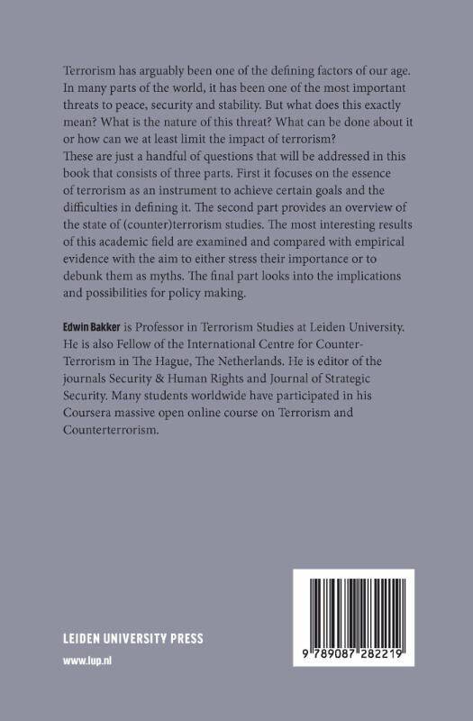 "Terrorism has arguably been one of the defining factors of our age. In many parts of the world, it has been one of the most important threats to peace, security and stability. But what does this exactly mean? What is the nature of this threat? What can be done about it or how can we at least limit the impact of terrorism? These are just a handful of questions that will be addressed in this book that consists of three parts. First it focuses on the essence of terrorism as an instrument to achieve certain goals and the difficulties in defining it. The second part provides an overview of the state of (counter)terrorism studies. The most interesting results of this academic field are examined and compared with empirical evidence with the aim to either stress their importance or to debunk them as myths. The final part looks into the implications and possibilities for policy making."