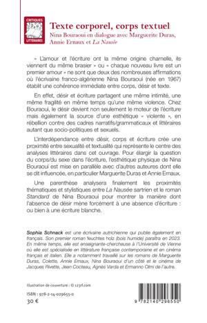 L'amour et l'écriture ont la même origine charnelle, ils viennent du même brasier ou chaque nouveau livre est un premier amour ne sont que deux des nombreuses affirmations où l'écrivaine franco-algérienne Nina Bouraoui (née en 1967) établit une cohérence immédiate entre corps, désir et texte. En effet, désir et écriture partagent une même intimité, une même fragilité en même temps qu'une même violence. Chez Bouraoui, le désir devient non seulement le moteur de l'écriture mais également la source d'une esthétique violente, en rébellion contre des cadres narratifs/grammaticaux et littéraires autant que socio-politiques et sexuels. L'interdépendance entre désir, corps et écriture crée une proximité entre sexualité et textualité qui représente le centre des analyses littéraires dans cet ouvrage. Pour élargir la question du corps/du sexe dans l'écriture, l'esthétique physique de Nina Bouraoui est mise en parallèle avec d'autres auteures dont elle se dit influencée, en particulier Marguerite Duras et Annie Ernaux. Une parenthèse analysera finalement les proximités thématiques et stylistiques entre La Nausée sartrien et le roman Standard de Nina Bouraoui pour montrer la manière dont l'absence de désir mène forcément à une absence d'écriture: ou bien à une écriture blanche.
