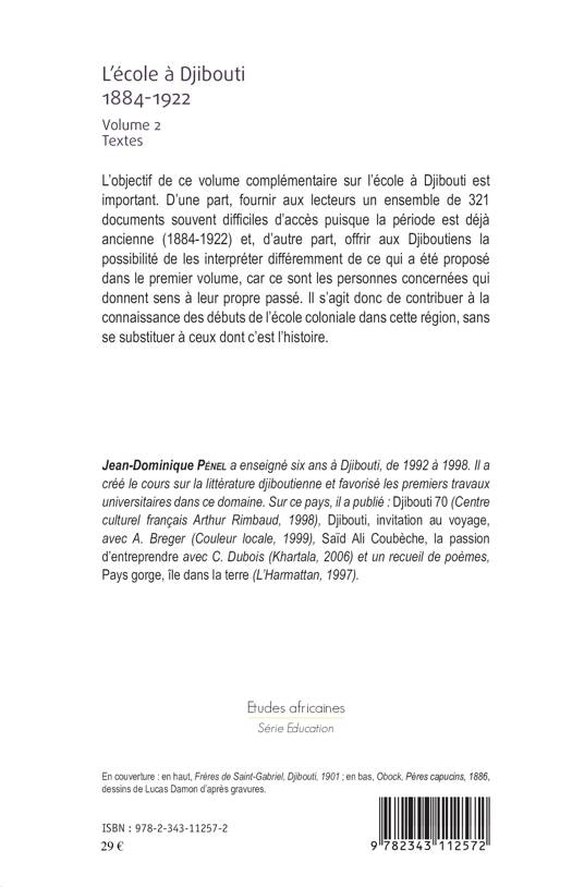 L'objectif de ce volume complémentaire sur l'école à Djibouti fournit aux lecteurs un ensemble de 321 documents souvent difficiles d'accès, la période étant déjà ancienne (1884 - 1922) . Il offre aux Djiboutiens la possibilité de les interpréter différemment de ce qui a été proposé dans le premier volume, car ce sont les personnes concernées qui donnent sens à leur propre passé. Il s'agit donc de contribuer à la connaissance des débuts de l'école coloniale dans cette région, sans se substituer à ceux dont c'est l'histoire.