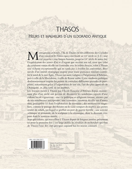 Montagneuse et boisee, l'OEle de Thasos est tres differente des Cyclades d'ou venaient les Grecs, qui y ont fonde au VIIe siecle av. J.-C. une cite promise a une longue histoire, jusqu'au VIIe siecle de notre ere. L'exploitation des mines d'or et d'argent que recelait son sol, ainsi que celui du continent voisin ou elle sut s'entendre avec les tribus thraces, valut a Thasos une richesse exceptionnelle qui ne tarda pas a eveiller les convoitises. Base navale d'un interet strategique majeur pour toute puissance voulant controler le nord de la mer Egee, Thasos sut aussi s'adapter a l'hegemonie d'Athenes, puis a celle de la Macedoine, a celle de Rome enfin. Cette modestie politique douloureusement acquise lui permit de connaitre differentes periodes de prosperite, notamment gryce a l'exportation de son vin, l'un des plus apprecies de l'Antiquite, et, plus tard, de ses marbres. Les travaux menes a Thasos par l'Ecole francaise d'Athenes depuis maintenant plus d'un siecle ont permis de decouvrir les nombreux aspects d'une culture locale vigoureuse: une vie politique et religieuse intense, attestee par de tres nombreuses inscriptions; une economie, rarement decelee sur d'autres sites, perceptible ici dans l'exploitation du territoire; des monuments singuliers, comme le passage des theores ou le vaste rempart de marbre aux portes ornees de reliefs, sur lequel se greffait un port de guerre fortifie; une activite artistique et artisanale, de la sculpture a la ceramique, dont la diversite s'expose dans le nouveau musee. Sept specialistes, qui travaillent a Thasos depuis de longues annees, presentent ici pour la premiere fois a un large public les resultats de recherches qui font de Thasos l'une des cites grecques aujourd'hui les mieux connues.