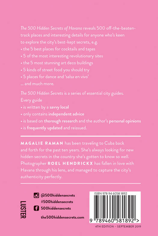 - The latest in the bestselling 500 Hidden Secrets series.- Havana is now the hottest travel destination for U.S. travelersOne of the hottest travel destinations in the Caribbean, Havana, La Habana, offers cultural experiences of every variety. Enjoy Chicharones from a street food vendor. Mix with locals on the beautiful Malecón. Choose from the best in cigars and rum at Casa del Ron y del Tabaco Cubano. Listen to classic Cuban music from the 1950s - including names like Celia Cruz and Benny More -- at Traditionales de los 50. Stand in the Plaza de la Revolución and imagine Castro's revolution. Walk through Parque de Miramar. Take in the enormous Cuban art collection at Museo de Bellas Artes. Visit two museums devoted to the life of Che Guevara. Enjoy the views of Havana from your room at Casa Alta. Even sing romantic ballads at El Salón del Bolero! Arrive as a tourist and leave like a native with this unusual guide to "La Alegría Cubana."
