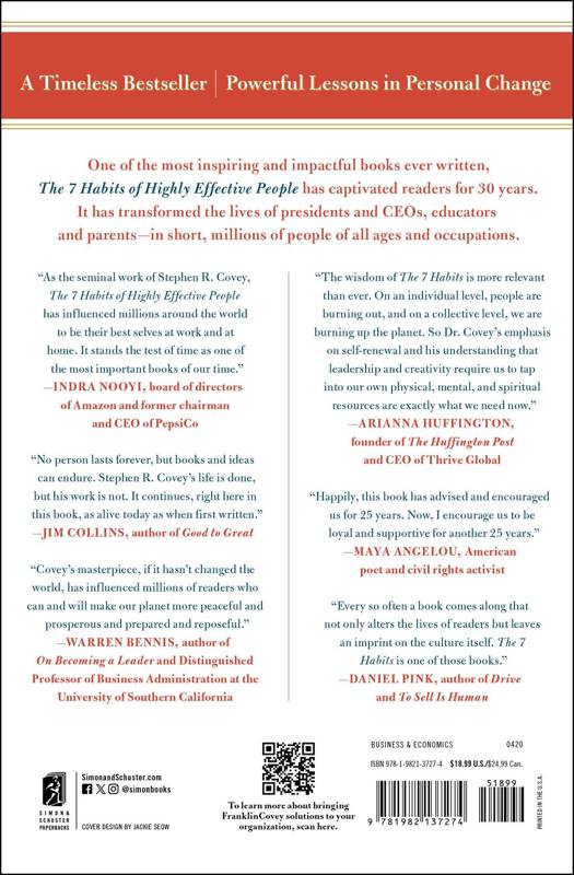 *New York Times bestseller--over 40 million copies sold* *The #1 Most Influential Business Book of the Twentieth Century* One of the most inspiring and impactful books ever written, The 7 Habits of Highly Effective People has captivated readers for nearly three decades. It has transformed the lives of presidents and CEOs, educators and parents--millions of people of all ages and occupations. Now, this 30th anniversary edition of the timeless classic commemorates the wisdom of the 7 Habits with modern additions from Sean Covey. The 7 Habits have become famous and are integrated into everyday thinking by millions and millions of people. Why? Because they work! With Sean Covey's added takeaways on how the habits can be used in our modern age, the wisdom of the 7 Habits will be refreshed for a new generation of leaders. They include: Habit 1: Be Proactive Habit 2: Begin with the End in Mind Habit 3: Put First Things First Habit 4: Think Win/Win Habit 5: Seek First to Understand, Then to Be Understood Habit 6: Synergize Habit 7: Sharpen the Saw This beloved classic presents a principle-centered approach for solving both personal and professional problems. With penetrating insights and practical anecdotes, Stephen R. Covey reveals a step-by-step pathway for living with fairness, integrity, honesty, and human dignity--principles that give us the security to adapt to change and the wisdom and power to take advantage of the opportunities that change creates.
