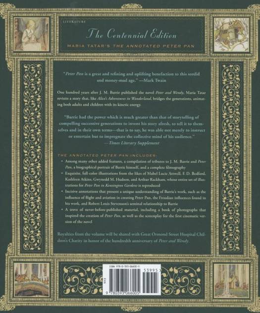 One hundred years after J. M. Barrie published the novel Peter and Wendy, Maria Tatar revisits a story that, like Alice in Wonderland, bridges the generations, animating both adults and children with its kinetic energy. The adventures of the Darling children with Peter Pan and Tinkerbell in Neverland are the seminal tale of escape and fantasy. Inspired by Barrie's real-life adventures with the five Llewelyn Davies boys he adopted, the story of Peter Pan has a deep and controversial history of its own that comes alive in Tatar's new edition. This brilliantly designed volume--with period photographs, full-color images by iconic illustrators, commentary on stage and screen versions, and an array of supplementary material, including Barrie's screenplay for a silent film--will draw readers into worlds of incandescent beauty, flooding them with the radiance of childhood wonder and the poignancy of what we lose when we grow up.
