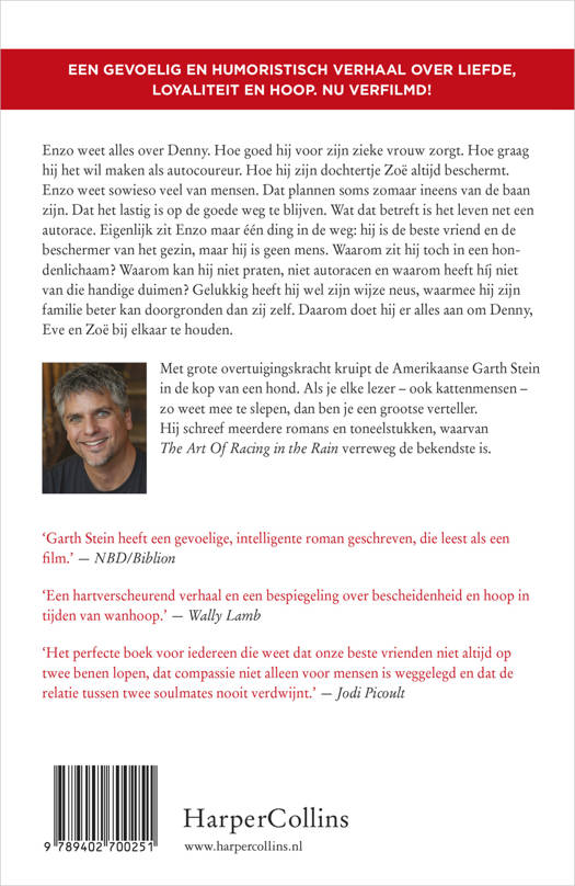 Enzo weet sowieso veel van mensen. Dat plannen soms zomaar ineens van de baan zijn. Dat het lastig is op de goede weg te blijven. Wat dat betreft is het leven net een autorace. Eigenlijk zit Enzo maar één ding in de weg: hij is de beste vriend en de beschermer van het gezin, maar hij is geen mens. Waarom zit hij toch in een hondenlichaam? Waarom kan hij niet praten, niet autoracen en waarom heeft híj niet van die handige duimen? Gelukkig heeft hij wel zijn wijze neus, waarmee hij zijn familie beter kan doorgronden dan zij zelf. Daarom doet hij er alles aan om Denny, Eve en Zoë bij elkaar te houden.