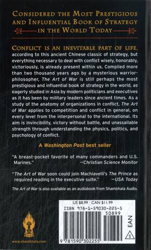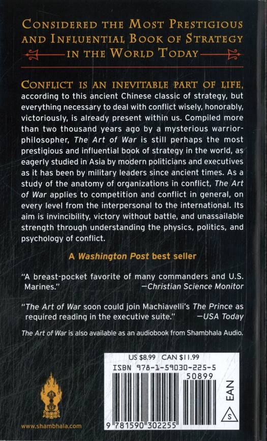 Conflict is an inevitable part of life, according to this ancient Chinese classic of strategy, but everything necessary to deal with conflict wisely, honorably, victoriously, is already present within us. Compiled more than two thousand years ago by a mysterious warrior-philosopher, The Art of War is still perhaps the most prestigious and influential book of strategy in the world, as eagerly studied in Asia by modern politicians and executives as it has been by military leaders since ancient times. As a study of the anatomy of organizations in conflict, The Art of War applies to competition and conflict in general, on every level from the interpersonal to the international. Its aim is invincibility, victory without battle, and unassailable strength through understanding the physics, politics, and psychology of conflict.