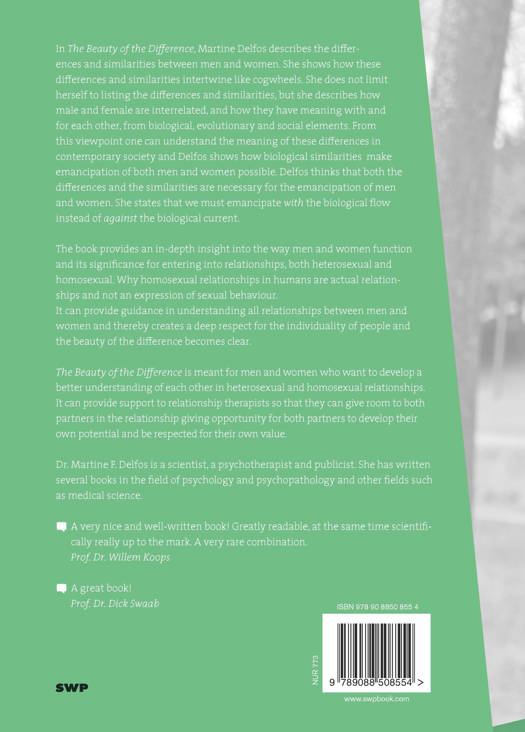 In The Beauty of the Difference, Martine Delfos describes the differences and similarities between men and women. She shows how these differences and similarities intertwine like cogwheels. She does not limit herself to listing the differences and similarities, but she describes how male and female are interrelated, and how they have meaning with and for each other, from biological, evolutionary and social elements. From this viewpoint one can understand the meaning of these differences in contemporary society and Delfos shows how biological similarities make emancipation of both men and women possible. Delfos thinks that both the differences and the similarities are necessary for the emancipation of men and women. She states that we must emancipate with the biological flow instead of against the biological current.