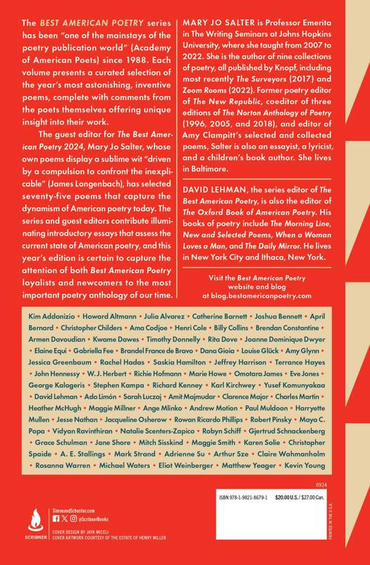 Renowned poet Mary Jo Salter, whose command of verse forms and high intelligence is universally acknowledged, selects the poems for the 2024 edition of The Best American Poetry, "a 'best' anthology that really lives up to its title" (Chicago Tribune).The Best American Poetry series has been "one of the mainstays of the poetry publication world" (Academy of American Poets) since 1988. Each volume presents a curated selection of the year's most brilliant, striking, and innovative poems, with comments from the poets themselves offering unique insight into their work. Here, guest editor Mary Jo Salter, whose own poems display a sublime wit "driven by a compulsion to confront the inexplicable" (James Longenbach), has picked seventy-five poems that capture the dynamism of American poetry today. The series and guest editors contribute valuable introductory essays that assess the current state of American poetry, and this year's edition is certain to capture the attention of both Best American Poetry loyalists and newcomers to the most important poetry anthology of our time.